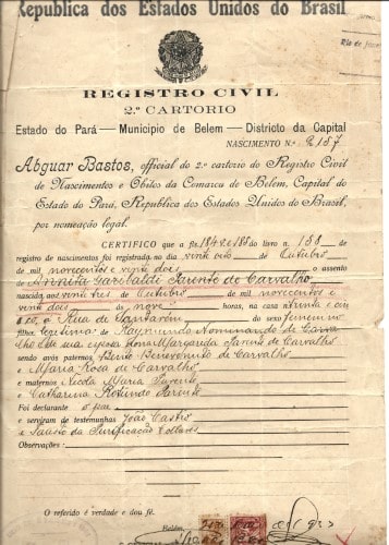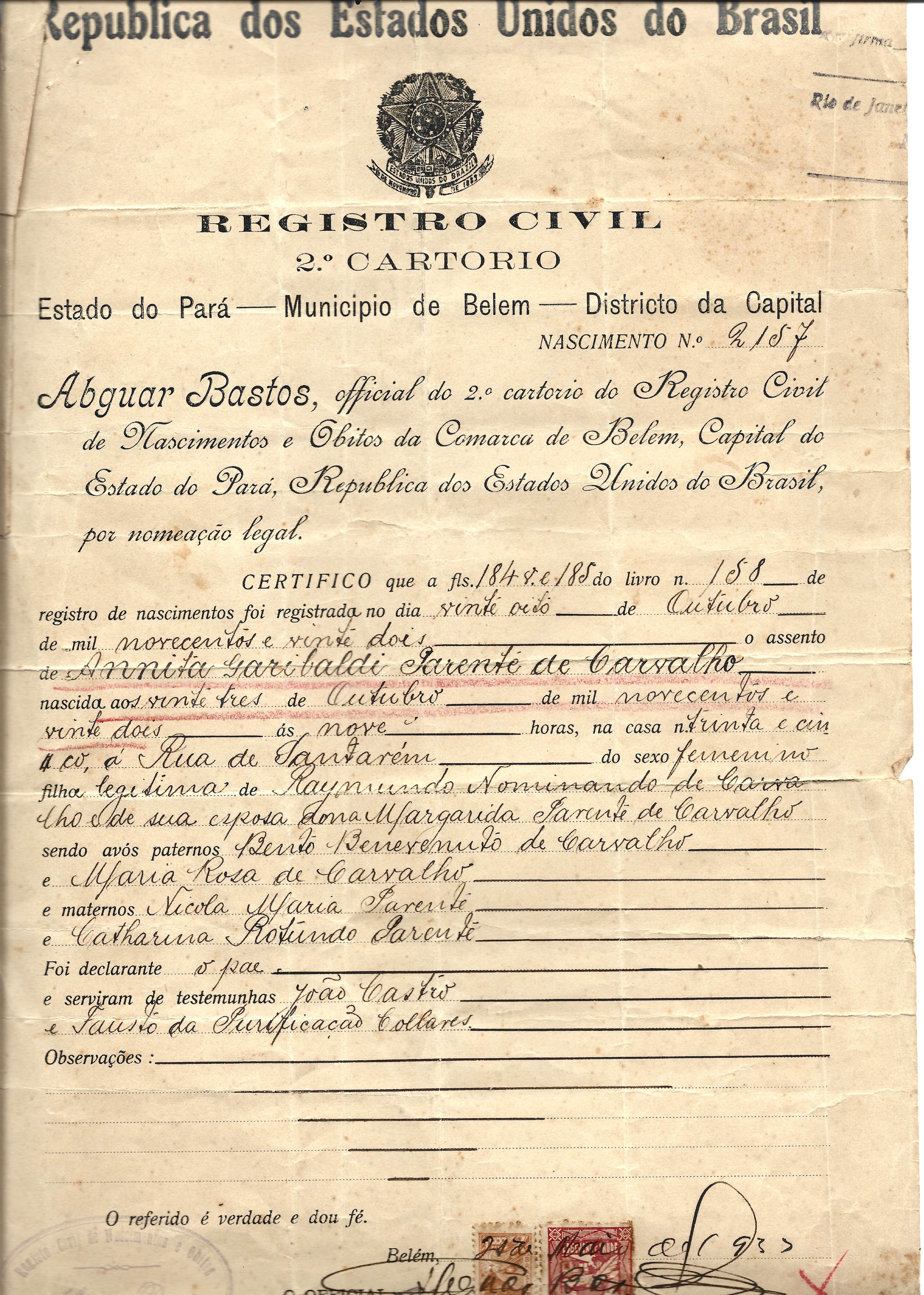 CERTIFICO que a fls./84 [8.?] e /85 do livro n.158 de registro de nascimentos foi registrado no dia vinte oito de Outubro de mil novecentos e vinte dois o assento de Annita Garibaldi Parente de Carvalho nascida aos vinte tres de Outubro de mil novecentos e vinte dois ás nove horas, na casa n.º trinta e cin_ co, á Rua de Santarém do sexo femenino filha legitima de Raymundo Nominando de Carva- lho e de sua esposa dona Margarida Parente de Carvalho sendo avós paternos Bento Benevenuto de Carvalho e Maria Rosa de Carvalho e maternos Nicola Maria Parente e Catharina Rotundo Parente Foi declaraente o pae e serviram de testemunhas João Castro e Fausto da Purificação Collares Observações: