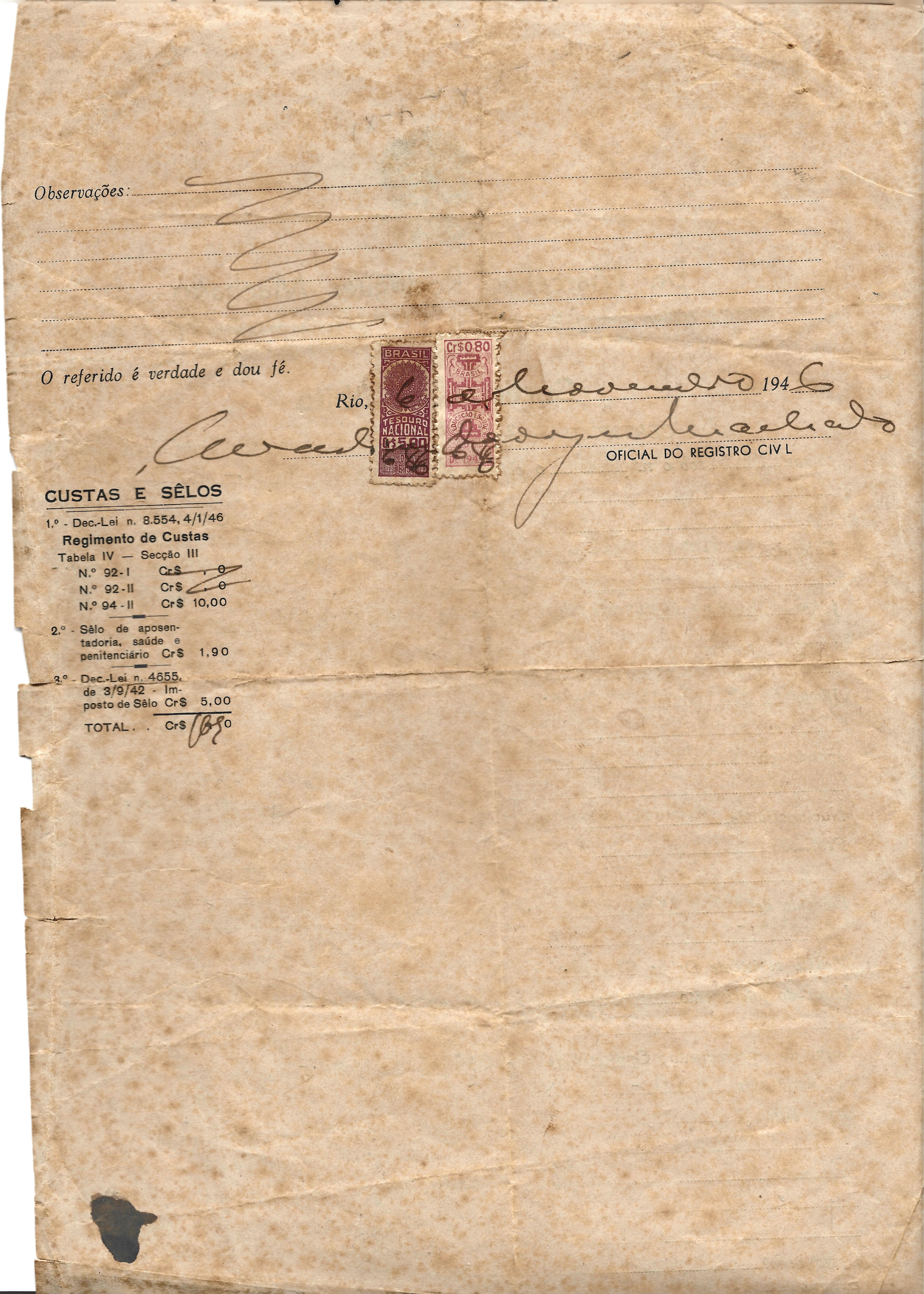 Rio, 6 de novembro 1946 OFICIAL DO REGISTRO CIVIL