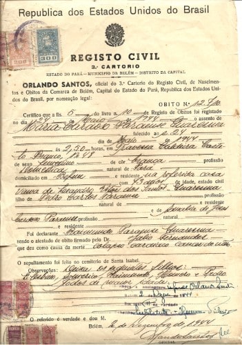 Certifico que a fls. 5 do livro n. 10 de Registo de Obitos foi registado no dia 24 de Maio de 1944 o assento de Maria Cardoso Paraense Quaresma falecido ao [?] 24 dia de Maio de 1944 ás 2,50 horas, em Travessa Caldeira Caste- lo Branco, Nº 48 de sexo femenino de côr branca profissão Domestica natural de Pará domiciliado em Belem e residente na referida casa com 73 anos de idade, estado civil viuva de Leandro Vitor dos Santos Quaresma filho de Pedro Carlos Paraense profissão — natural de — e residente — e de Amalia de Jesus Cardoso Paraense profissão — natural — e residente —
