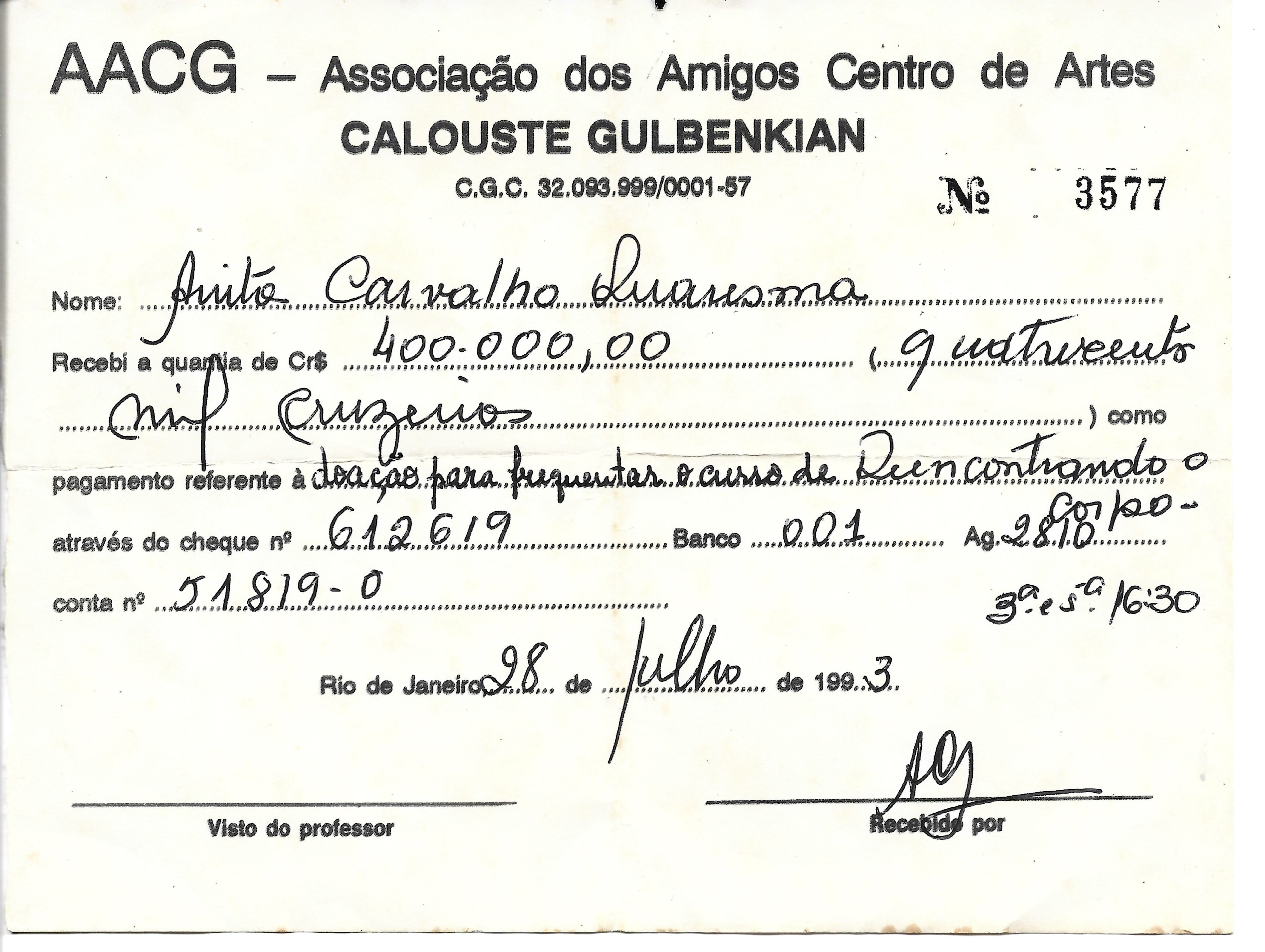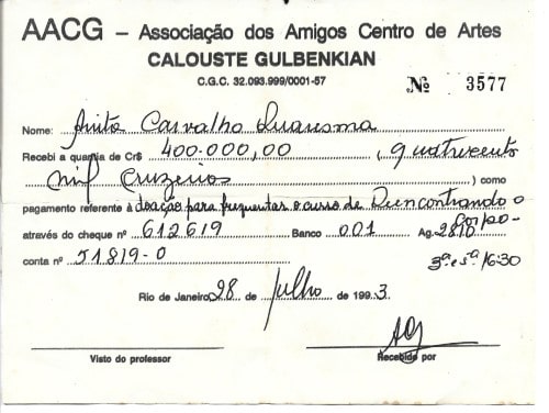 Nome: An[n]ita Carvalho Quaresma Recebi a quantia de Cr$ 400.000,00 (quatrocentos mil cruzeiros) como pagamento referente à doação para frequentar o curso de Reencontrando o Corpo através do cheque nº 612619 Banco 001 Ag. 2810 conta nº 51819-0