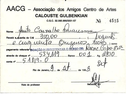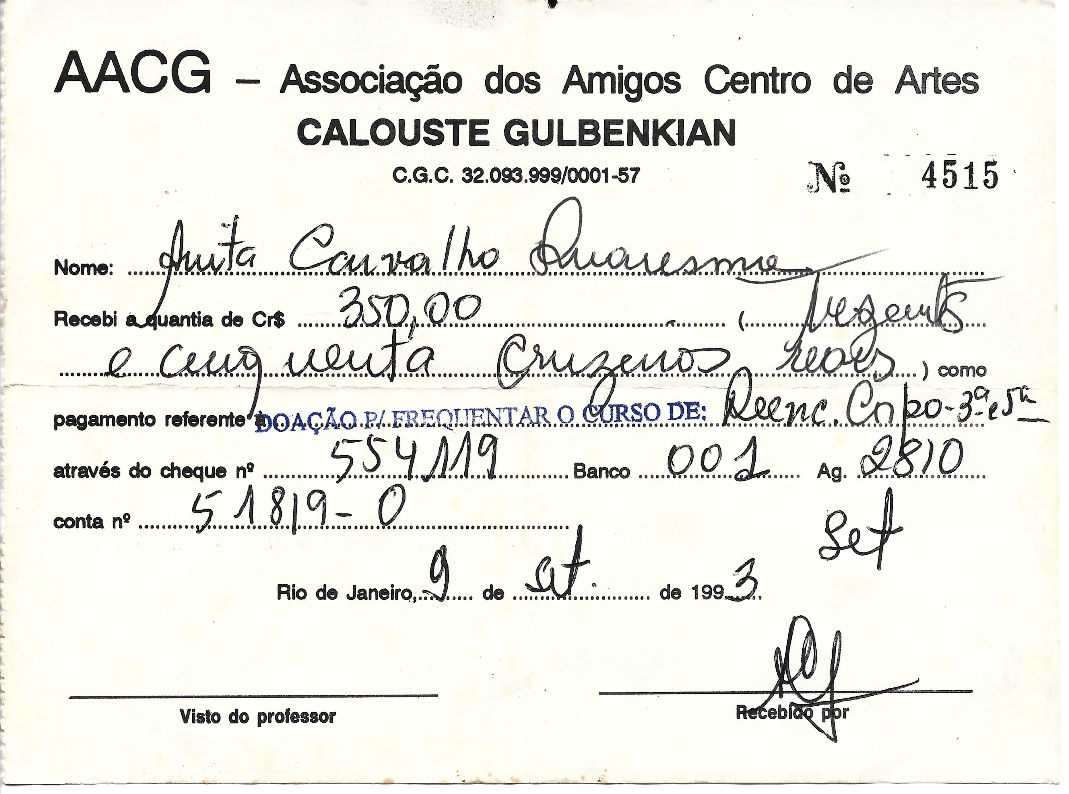 Nome: An[n]ita Carvalho Quaresma Recebi a quantia de Cr$ 350,00 (trezentos e cinquenta cruzeiros reais) como pagamento referente à DOAÇÃO P/ FREQUENTAR O CURSTO DE: Reenc. Corpo - 3ª e 5ª através do cheque nº 554119 Banco 001 Ag. 2810 conta nº 51819-0