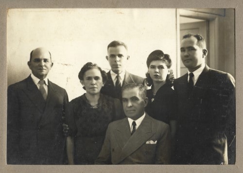 Fotografia de Annita com seus tios que a criaram, tia Gahida e tio José Figueredo, seu primo e irmão de criação José Carvalho de Figueredo, seu primo Theodomiro Amanajás de Carvalho (Tedoca) e seu marido Homero.