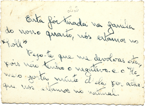 Peço-te que me devolvas esta, pois não tenho o negativo e o Ho_ mero gosta muito d'ela por achar que nós estamos no natural.