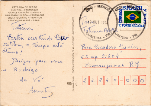 Cartão postal de Annita a Tatiana, enviado em 17 de outubro de 1994. Em seu anverso, possui foto de uma seção da Estrada de Ferro Curitiba–Paranaguá, em Curitiba, PR.