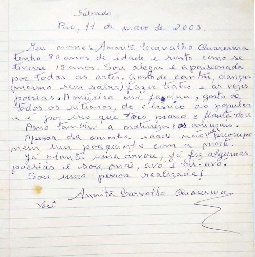 Meu nome: Annita Carvalho Quaresma tenho 80 anos de idade e sinto como se tivesse 18 anos. Sou alegre e apaixonada por todas as artes. Gosto de cantar, dançar (mesmo sem saber) fazer teatro e as vezes poesias. A música me fascina, gosto de todos os rítimos, do clássico ao popular e é por isso que toco piano e flauta-doce Amo também a natureza e os animais. Apesar da minha idade não me preocupo nem um pouquinho com a morte. Já plantei uma árvore, já fiz algumas poesias e sou mãe, avó e bis-avó. Sou uma pessoa realizada!