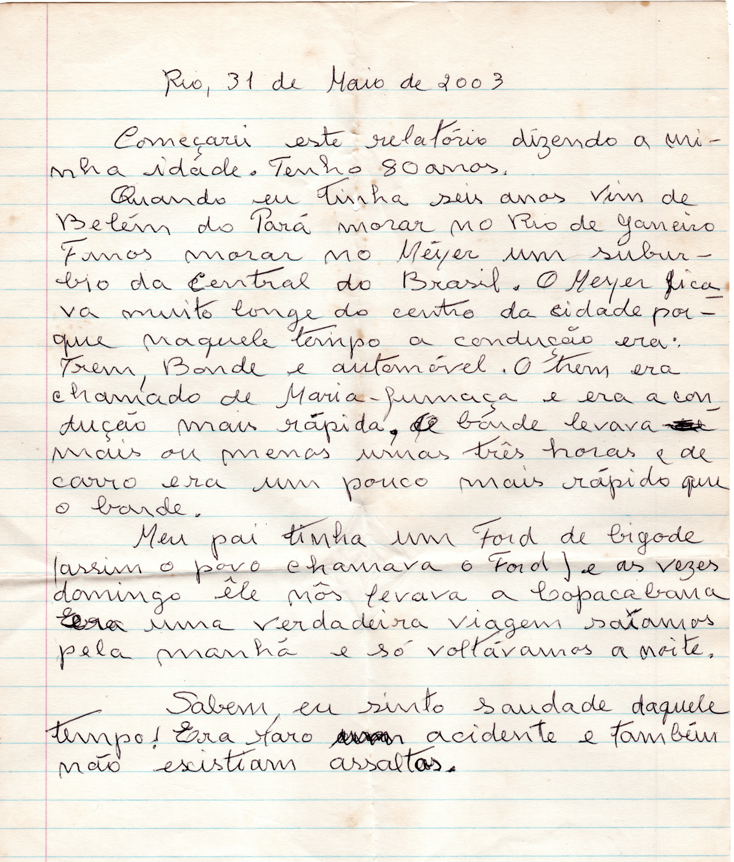 Quando eu tinha seis anos vim de Belém do Pará morar no Rio de Janeiro Fomos morar no Méyer um subur- bio da Central do Brasil. O Meyer fica_ va muito longe do centro da cidade por- que naquele tempo a condução era: Trem, Bonde e automóvel. O trem era chamado de Maria-fumaça e era a con_ dução mais rápida, de bonde levava mais ou menos umas três horas e de carro era um pouco mais rápido que o bonde.