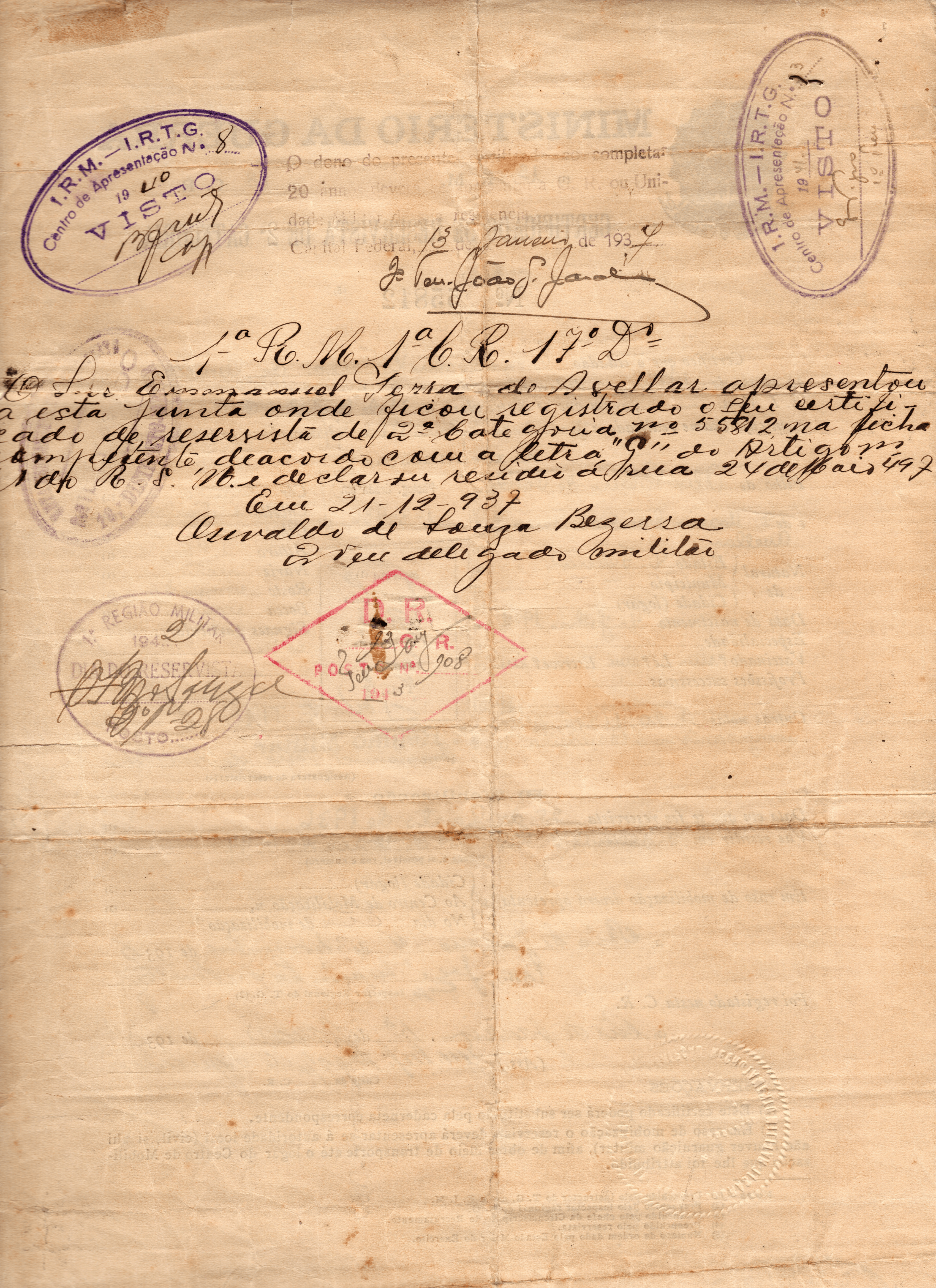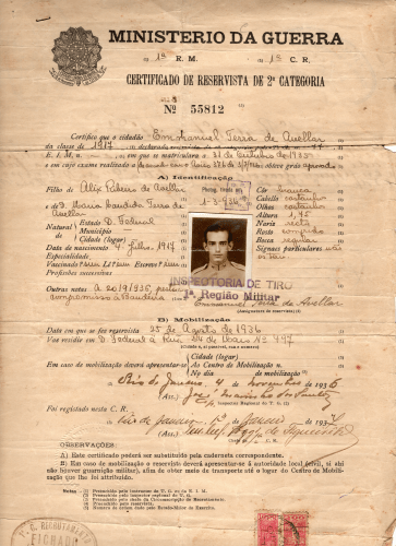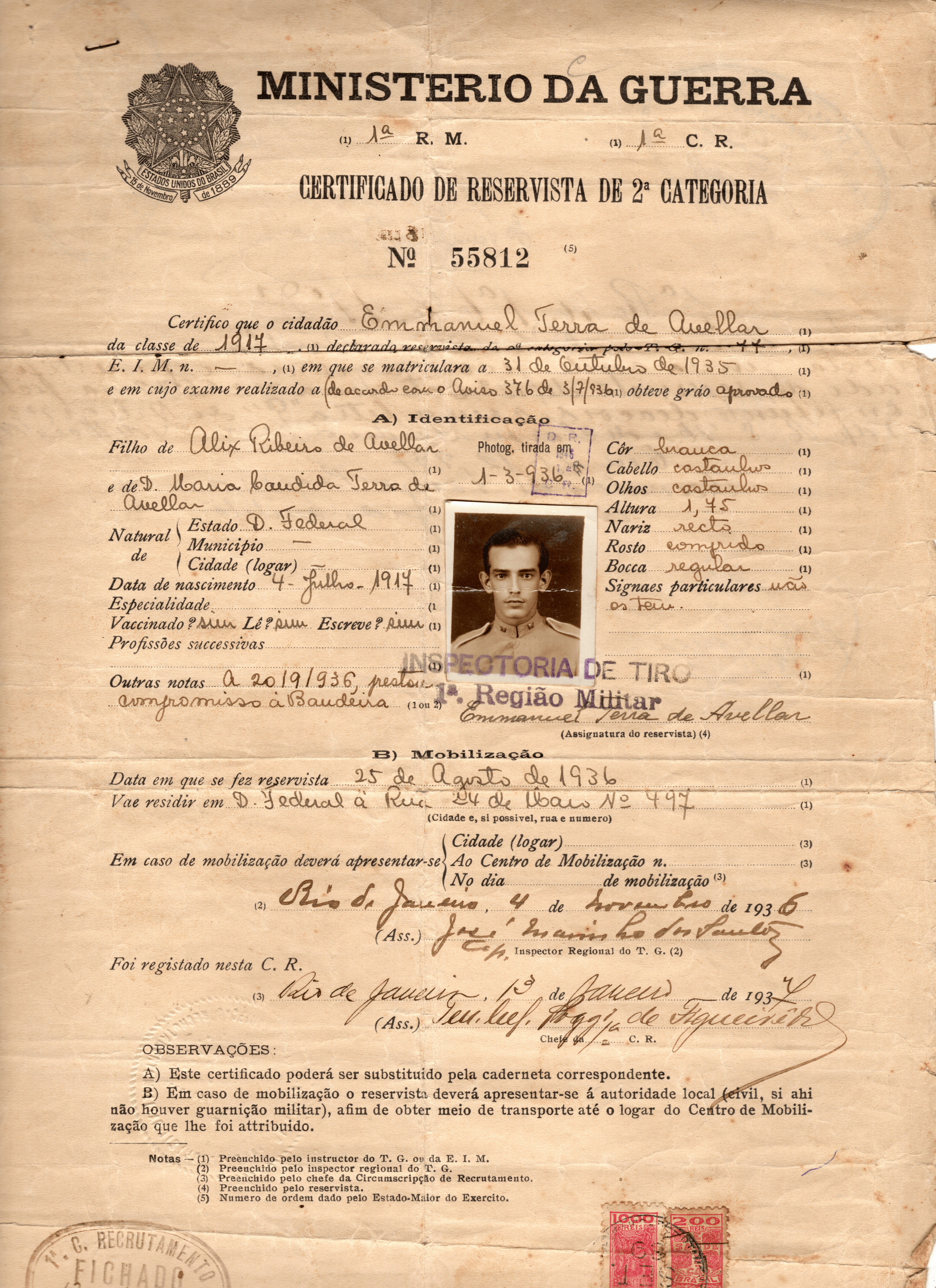 Certificado de reservista de Emmanuel Terra de Avellar, de 13 de janeiro de 1937. Se fez reservista em 25 de agosto de 1936.