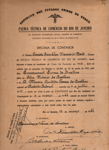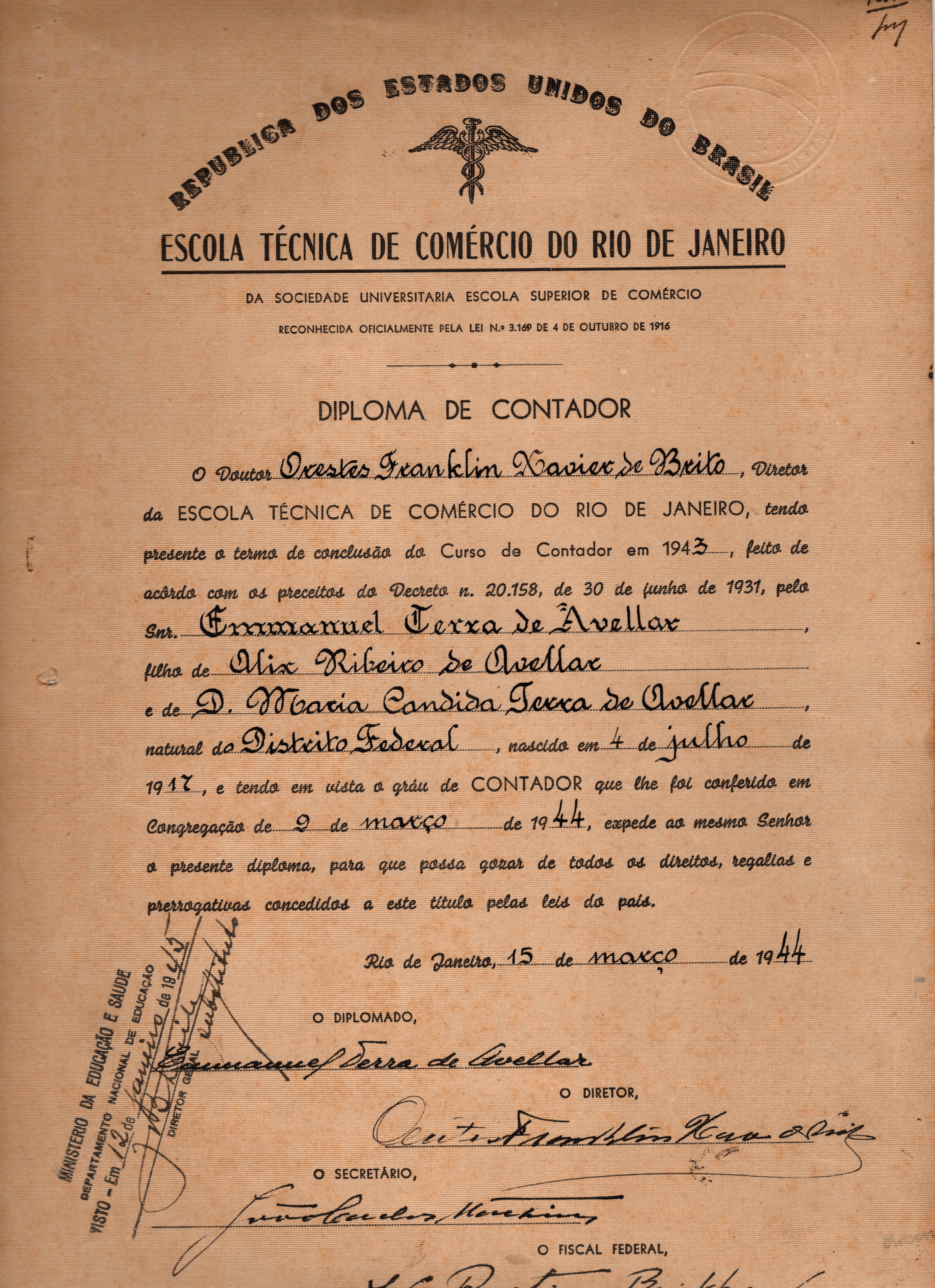O Doutor Orestes Franklin Xavier de Brito, Diretor da ESCOLA TÉCNICA DE COMÉRCIO DO RIO DE JANEIRO, tendo presente o termo de conclusão do Curso de Contador em 1943, feito de acôrdo com os preceitos do Decreto n. 20.158, de 30 de junho de 1931, pelo Snr. Emmanuel Terra de Avellar, filho de Alix Ribeiro de Avellar e de D. Maria Candida Terra de Avellar, natural do Distrito Federal, nascido em 4 de julho de 1917, e tendo em vista o gráu de CONTADOR que lhe foi conferido em Congregação de 9 de março de 1944, expede ao mesmo Senhor o presente diploma, para que possa gozar de todos os direitos, regalias e prerrogativas concedidos a este título pelas leis do país.