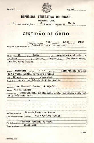 Certidão de óbito de Emmanuel Terra de Avellar, de 26 de junho de 1988. Filho de Alix Ribeiro de Avellar e Maria Candida Terra de Avellar. Casado. Faleceu em 26 de junho de 1988 às 04:50, com 70 anos.