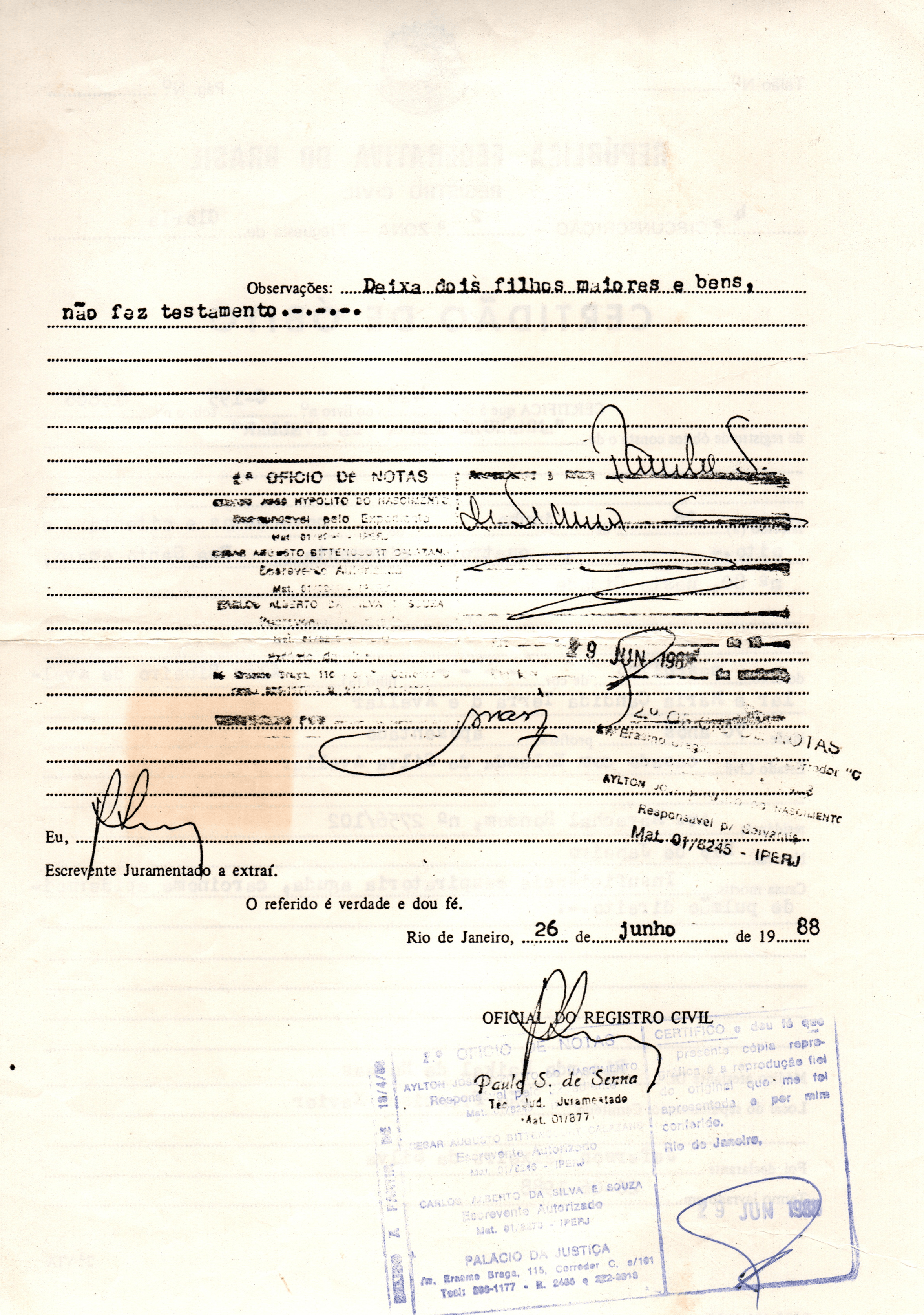 Rio de Janeiro, 26 de junho de 1988 OFICIAL DO REGISTRO CIVIL