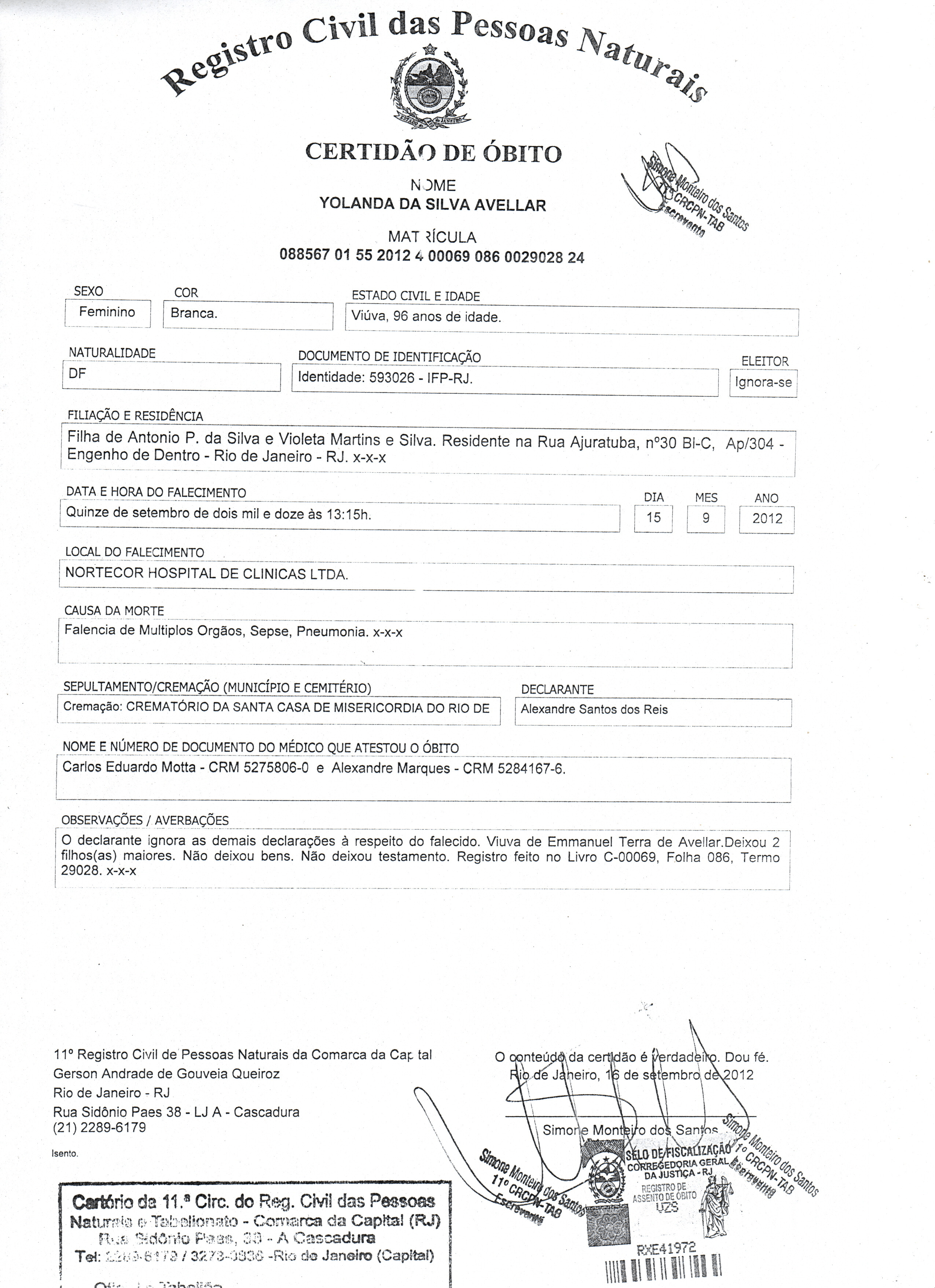 Certidão de óbito de Yolanda da Silva Avellar, de 16 de setembro de 2012. Filha de Antonio Pereira da Silva e Violeta Martins e Silva. Viúva. Faleceu em 15 de setembro de 2012 às 13:15, com 96 anos.