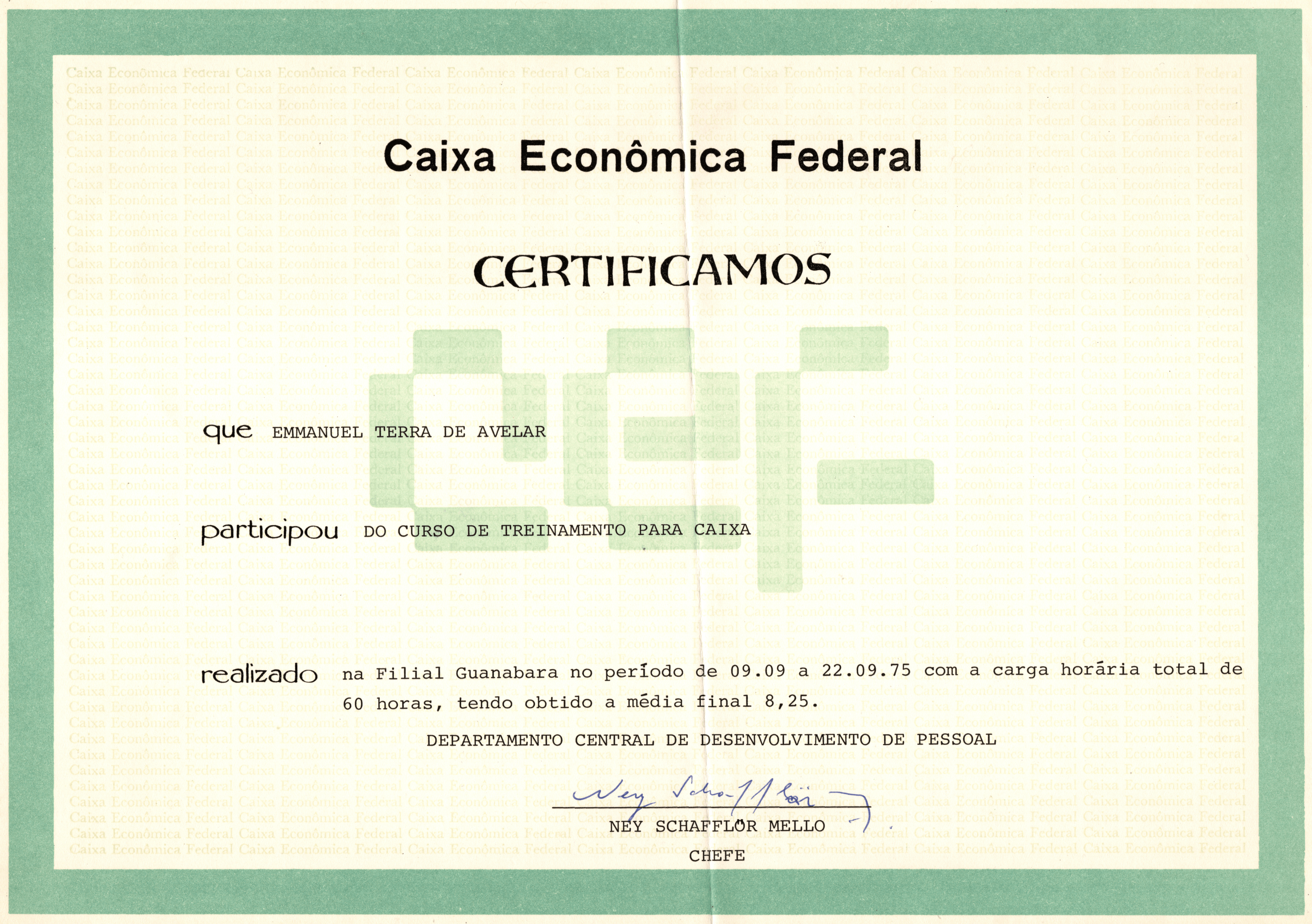 que EMMANUEL TERRA DE AVEL[L]AR participou DO CURSO DE TREINAMENTO PARA CAIXA realizado na Filial Guanabara no período de 09.09 a 22.09.75 com carga horária total de 60 horas, tendo obtido a média final 8,25.