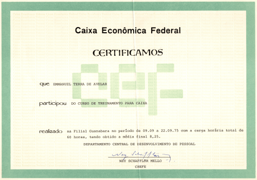 Certificado de Emmanuel Terra de Avellar, referente a curso de treinamento para caixa da Caixa Econômica Federal, terminado em 22 de setembro de 1975. Ele teria 58 anos na época.